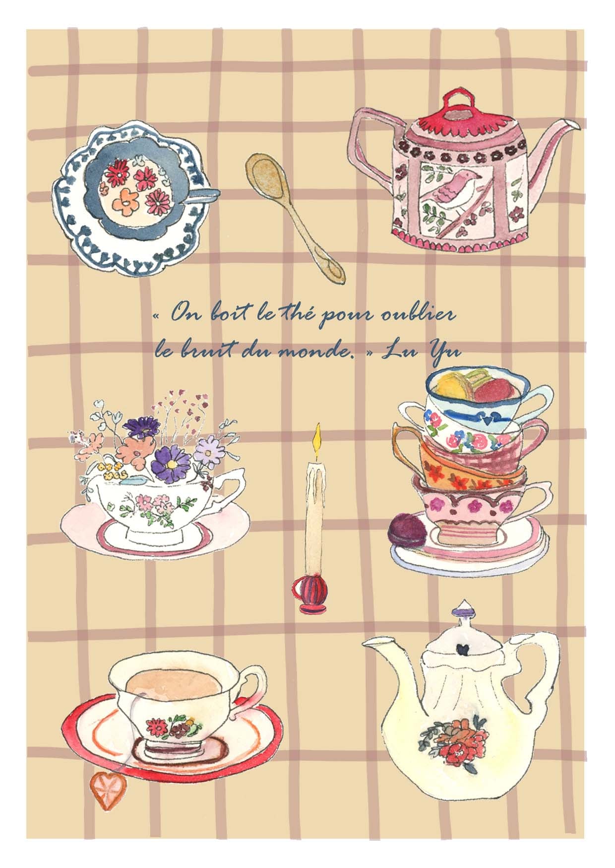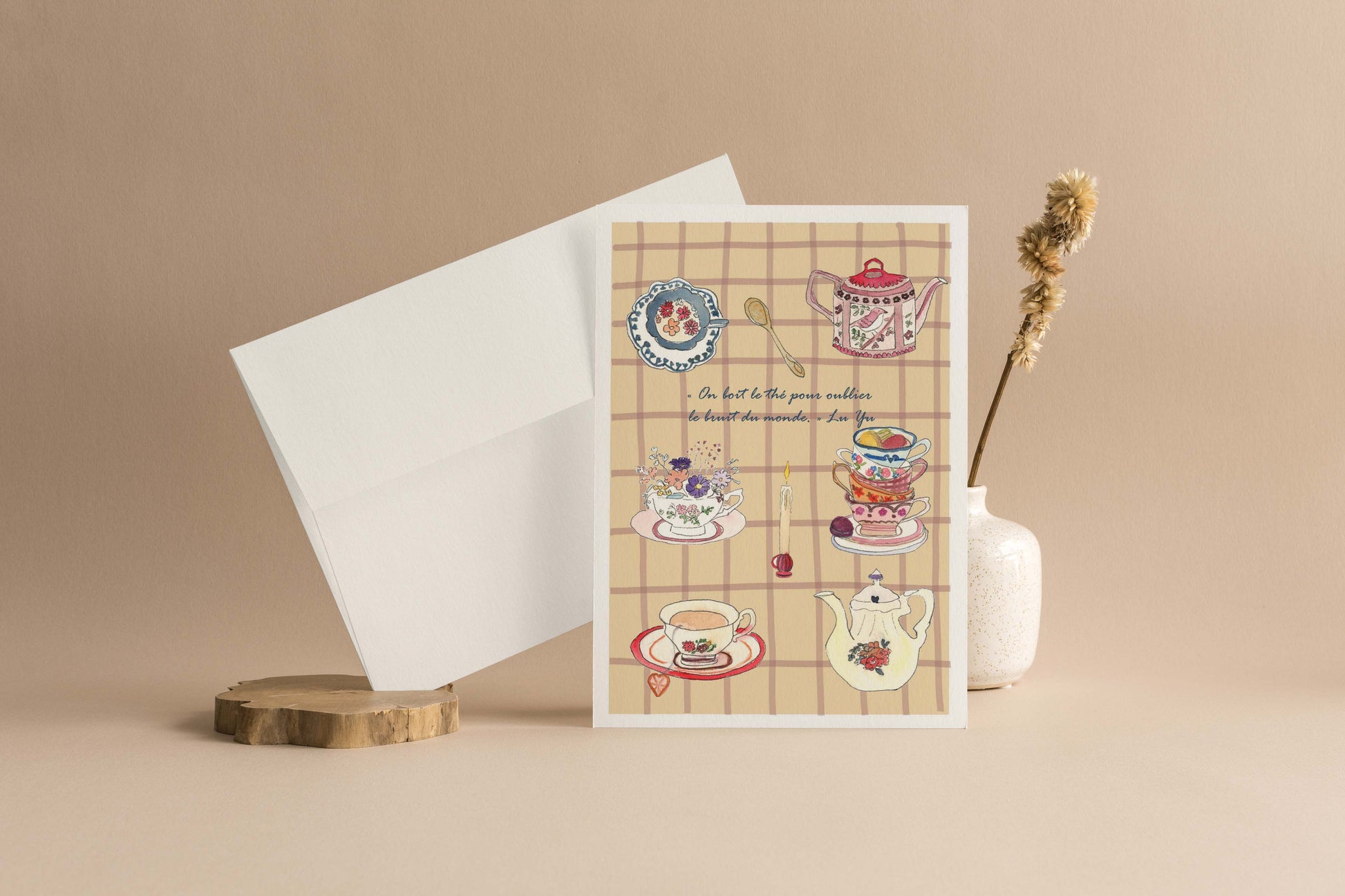 Partagez un moment de douceur avec la carte postale “Instants chéris”, décorée d’illustrations délicates dans des tons beige et rose : théières, tasses, cuillères et macarons se mêlent dans un motif raffiné, accompagné d’une citation de Lu Yu sur l’art du thé. Parfaite pour glisser un mot tendre, accompagner une attention ou simplement offrir un moment de rêverie, elle invite à la sérénité et à la gourmandise.
