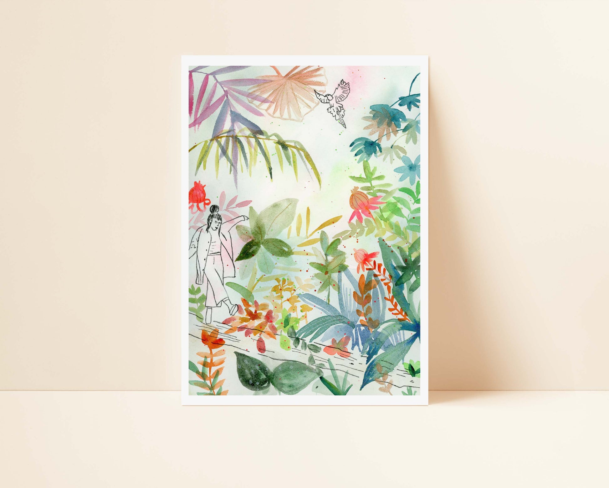 La collection “Sérénité” célèbre la douceur d’être soi, à travers des illustrations vibrantes où la végétation luxuriante devient un refuge, un terrain de jeu, un espace intérieur.