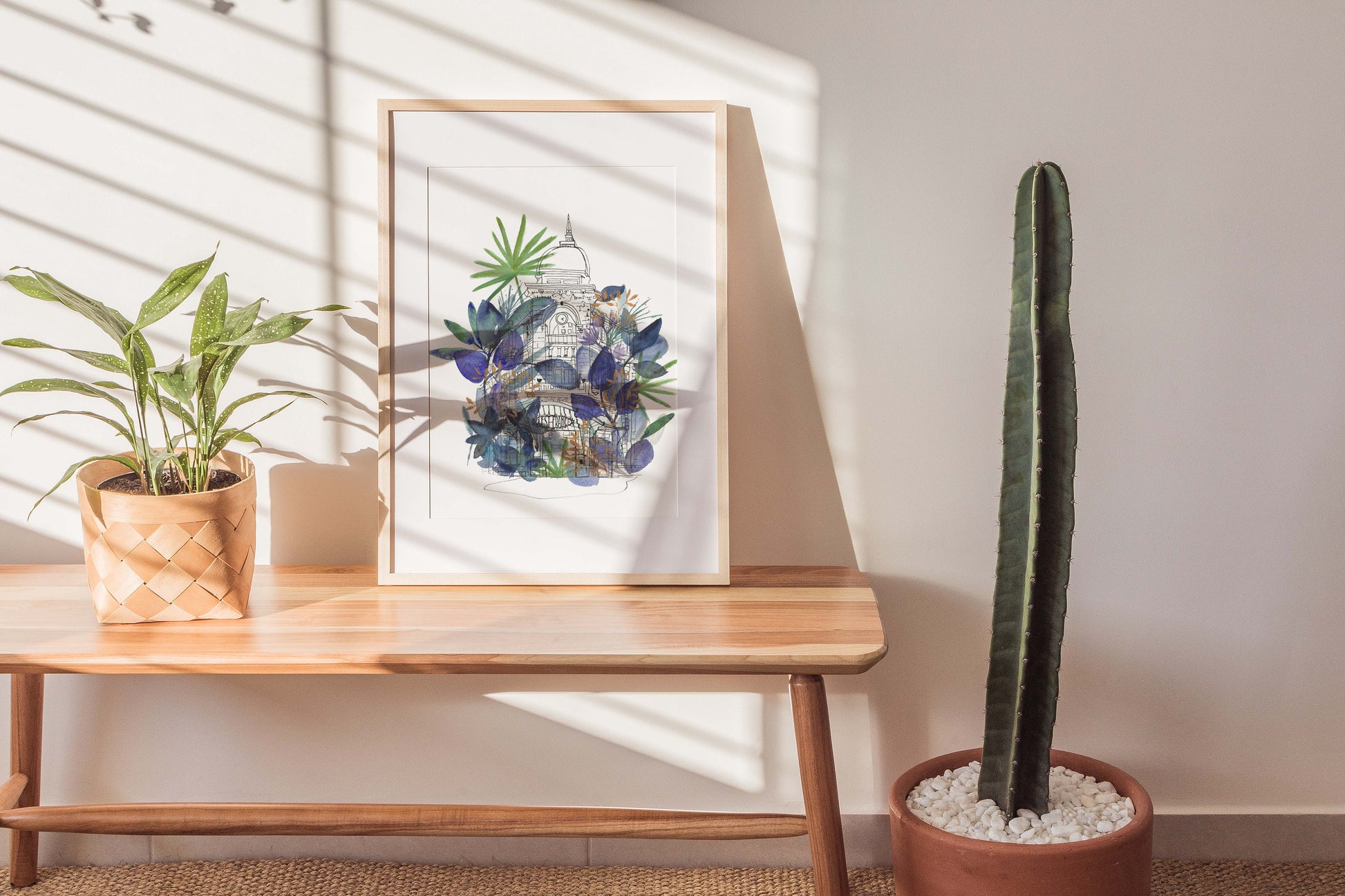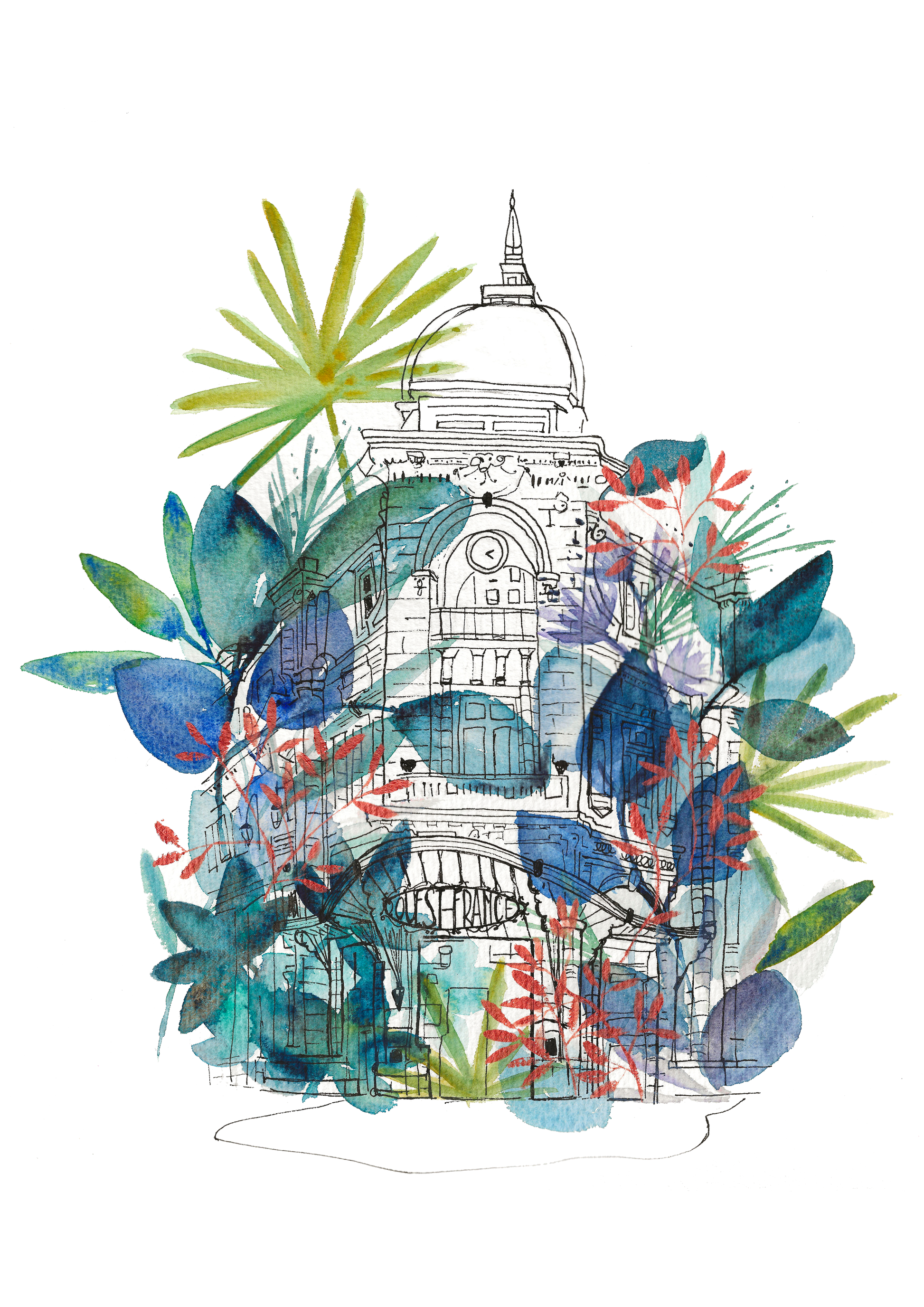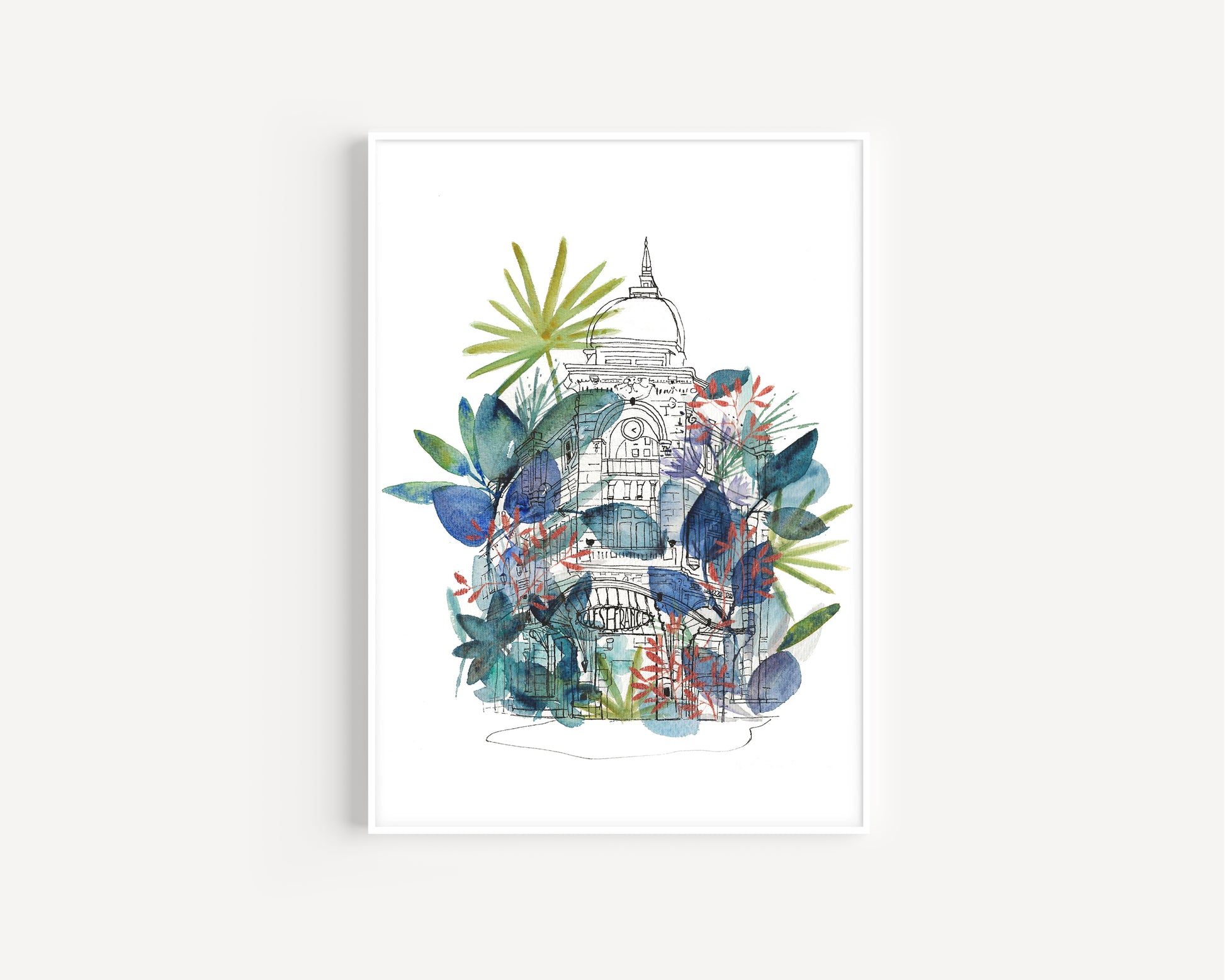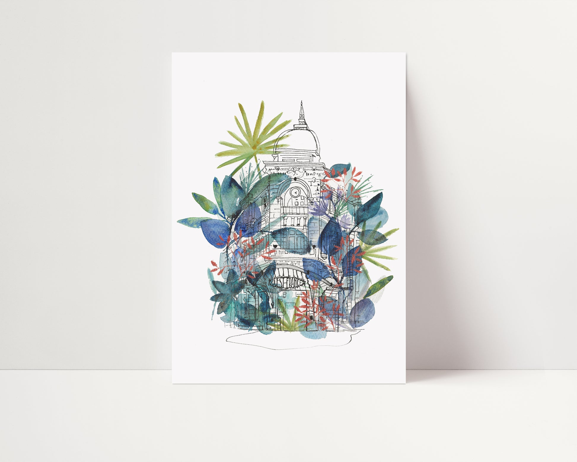 Découvrez Rennes autrement, à travers la collection “Jungle urbaine”, où les bâtiments emblématiques de la ville s’épanouissent au cœur d’une végétation luxuriante. Une balade poétique entre rues familières et nature débordante, un regard tendre et coloré porté sur la ville que tu habites.